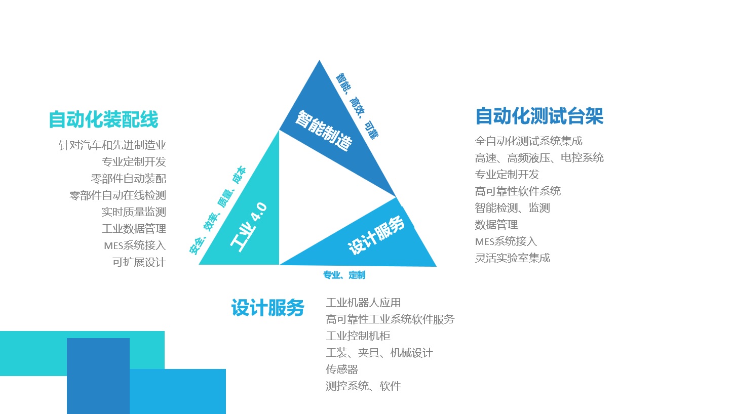 在自動化裝配線領(lǐng)域,為客戶提供定制化的、高性價(jià)比的解決方案。在智能傳感器、機(jī)器人應(yīng)用等領(lǐng)域具有技術(shù)優(yōu)勢,幫助客戶提高產(chǎn)品質(zhì)量、提高生產(chǎn)效率、降低生產(chǎn)成本和強(qiáng)化安全。在自動化測試臺架領(lǐng)域,在高速、高頻的電控和液壓測試系統(tǒng)方面具有豐富的經(jīng)驗(yàn),為客戶提供全面的自動化測試系統(tǒng)解決方案。